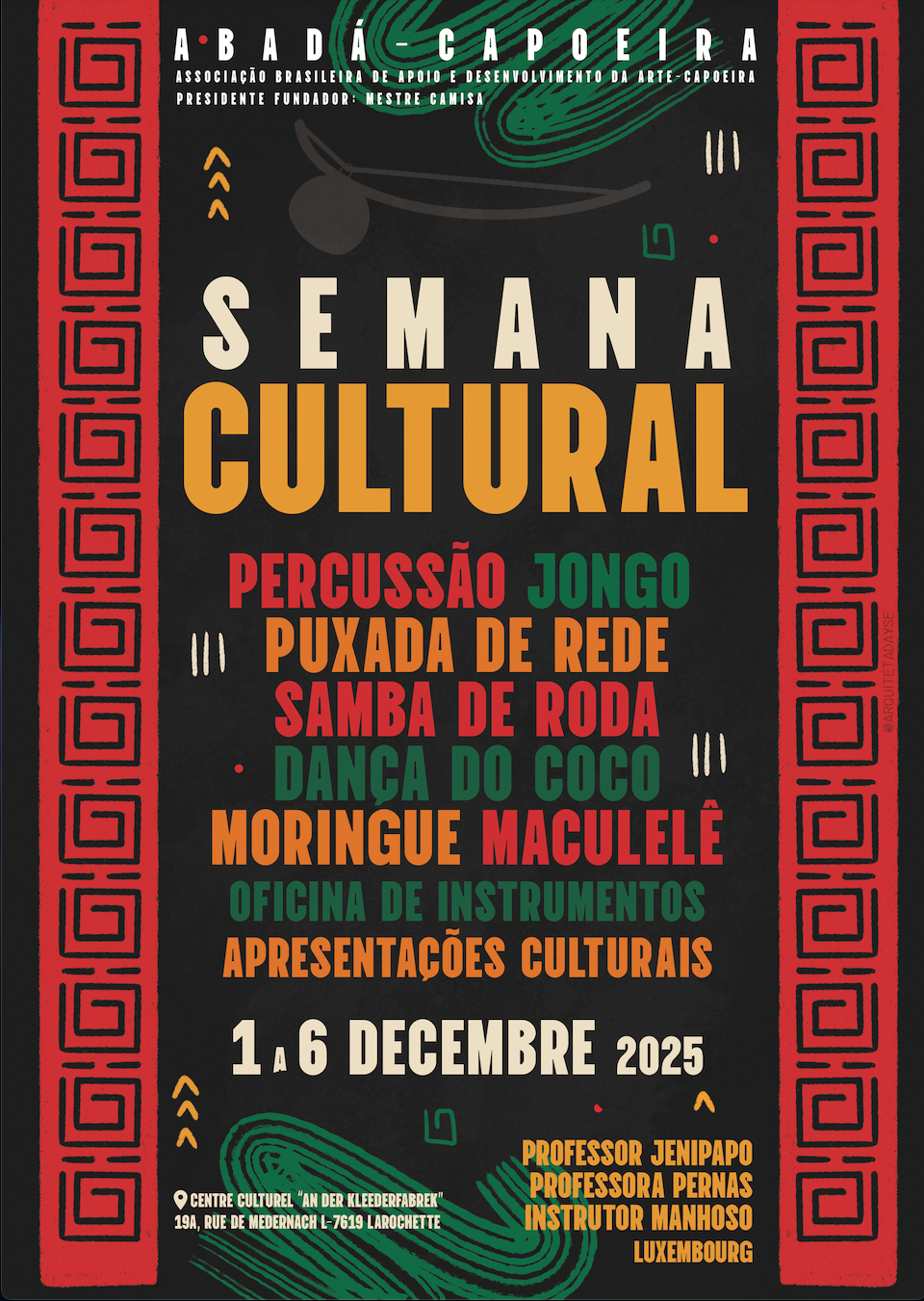 De 1 a 6 de dezembro de 2025, o Centro Culturel “San der Kleebierhaff” será palco de uma grande celebração das tradições afro-brasileiras. A ABADÁ Capoeira Luxemburgo convida todos para participar da Semana Cultural, um evento vibrante que une ritmo, corpo e ancestralidade.