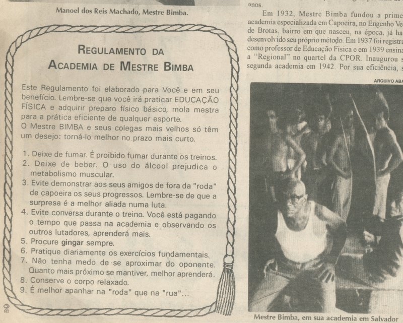 Nasce Mestre Bimba (Manoel dos Reis Machado), criador da Capoeira Regional, incorporando elementos do batuque e metodologia própria. Quando Bimba nasceu, a capoeira era praticada nos portos e mercados populares, onde a maioria dos trabalhadores eram negros e literalmente lutavam, se enfrentavam fisicamente, pelo emprego, pelo trabalho ou simplesmente pela atenção das mulheres. Capoeira não era apenas uma prática, era também um tipo social. O “capoeira” era um marginal que ameaça a ordem pública.