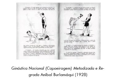 Em 1928, Aníbal Burlamaqui, militar e capoeirista, publica o primeiro livro didático chamado “Ginástica Nacional (Capoeiragem) Metodizada e Regrada” que fala sobre a capoeira, descrevendo golpes e sequências. O autor se foca principalmente nas regras e características do pugilismo, desenvolve um método e um código de regras para a prática do “jogo desportivo da Capoeira”. Para tal intuito despreza totalmente o lado lúdico, cultural e artístico inerente a esta modalidade, deixando de lado a música e os instrumentos e privilegiando apenas seu caráter de luta esportiva.