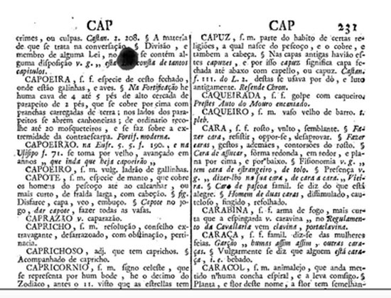 "Capoeira" é registrada no dicionário do padre Rafael Bluteau e aparece como sinônimo de “cesto” ou “gaiola”. É uma das primeiras referências lexicais da palavra mas ainda sem sentido de luta.