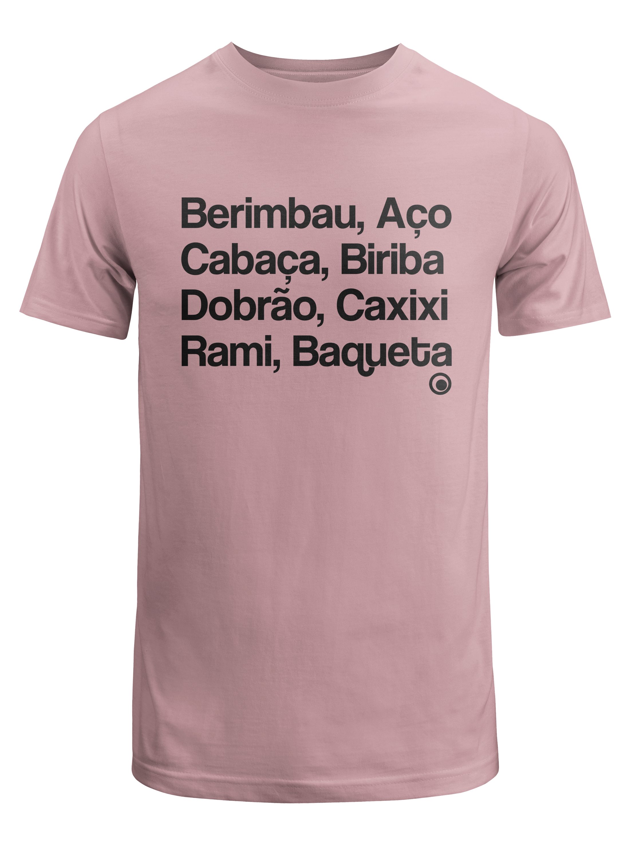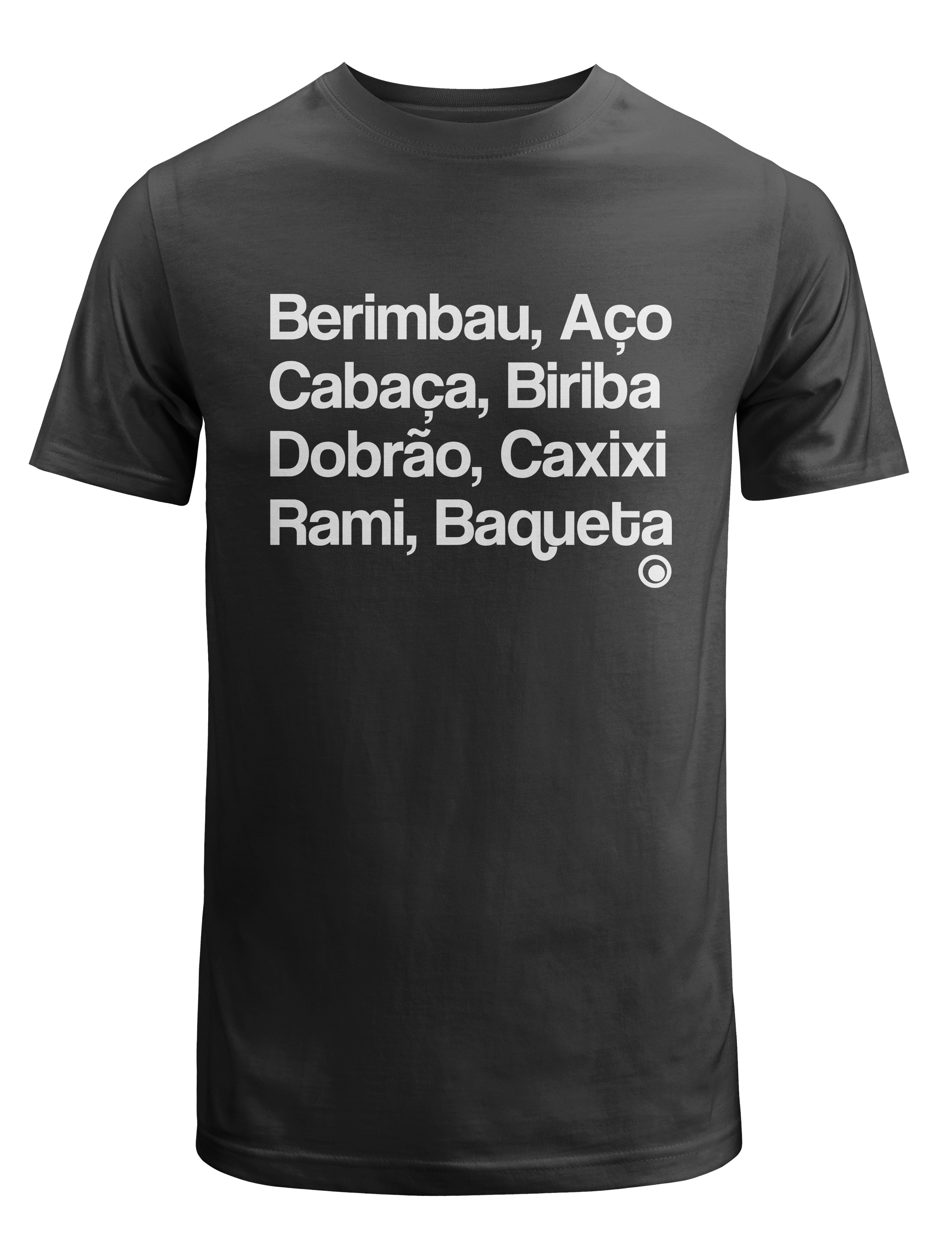 Camiseta com design frontal de “Berimbau, Aço”. Algodão macio.